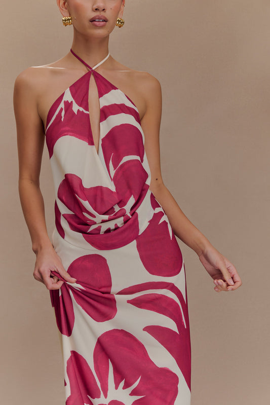 Katalina Chiffon Cowl Halter Top - Red Deco Fleur Print
