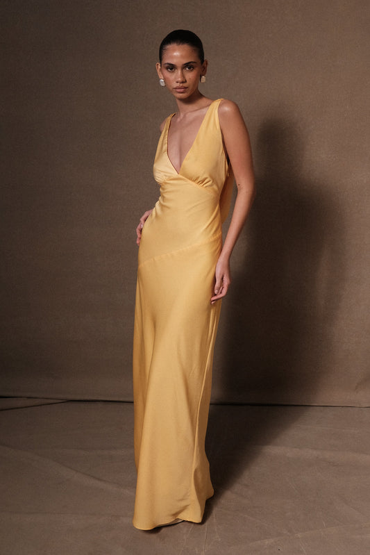 Larissa Satin Maxi Dress With Ruched Petals - Lemon