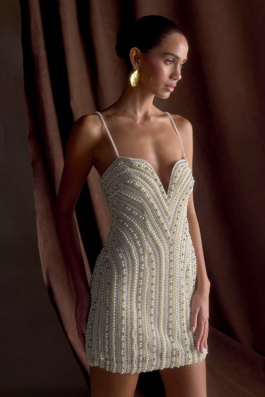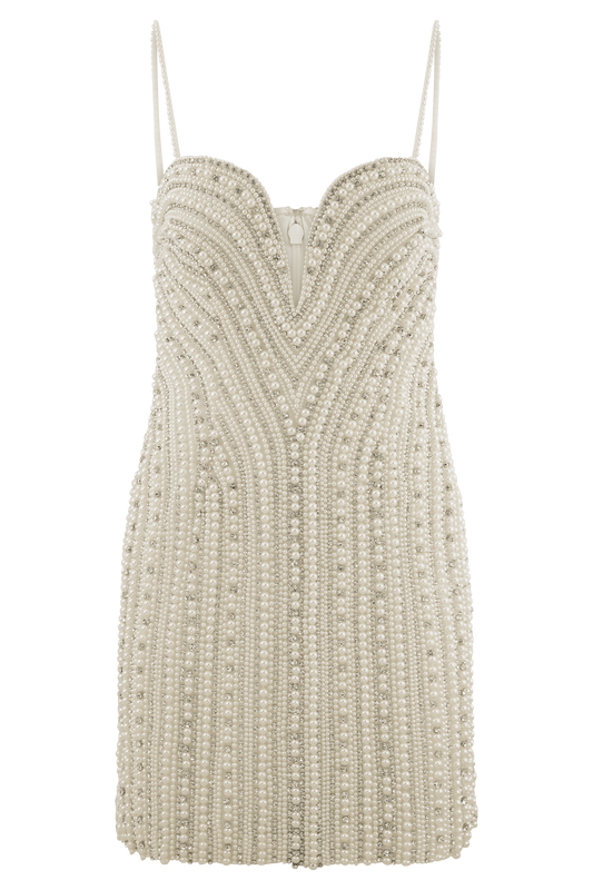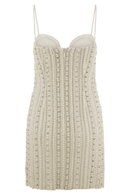 Eva Hand Beaded Pearl & Lace Mini Dress - White