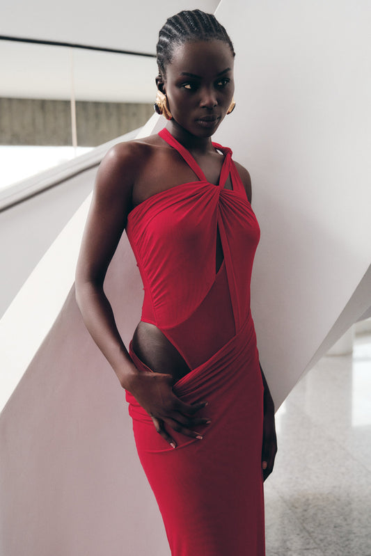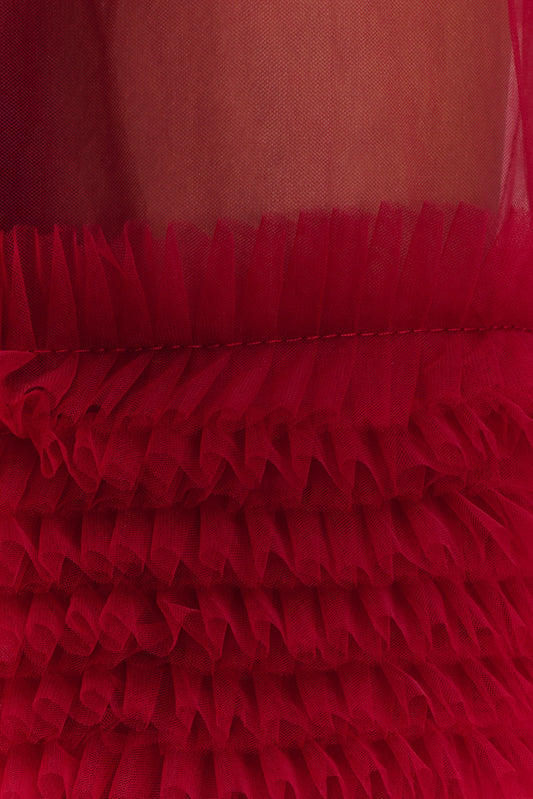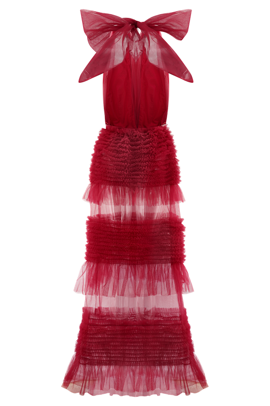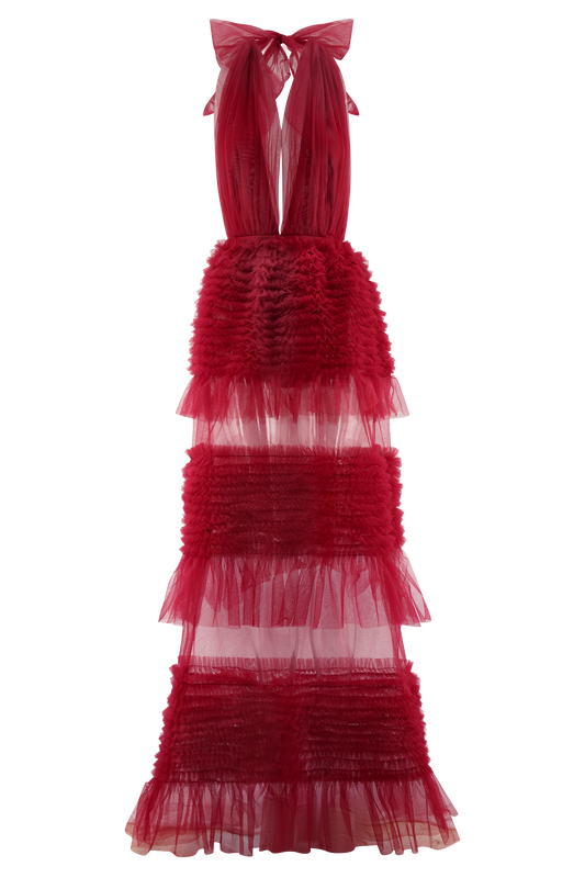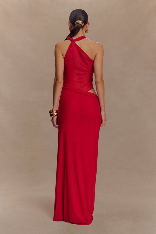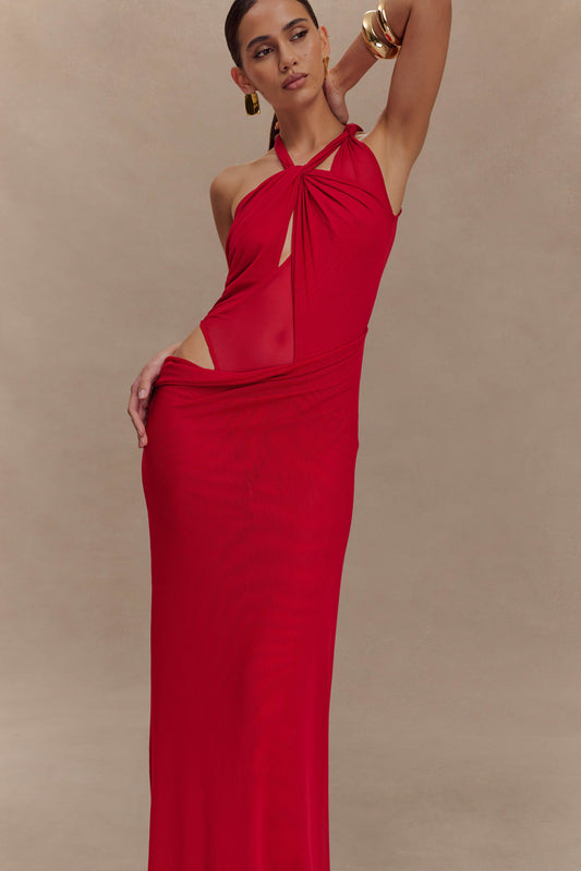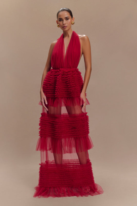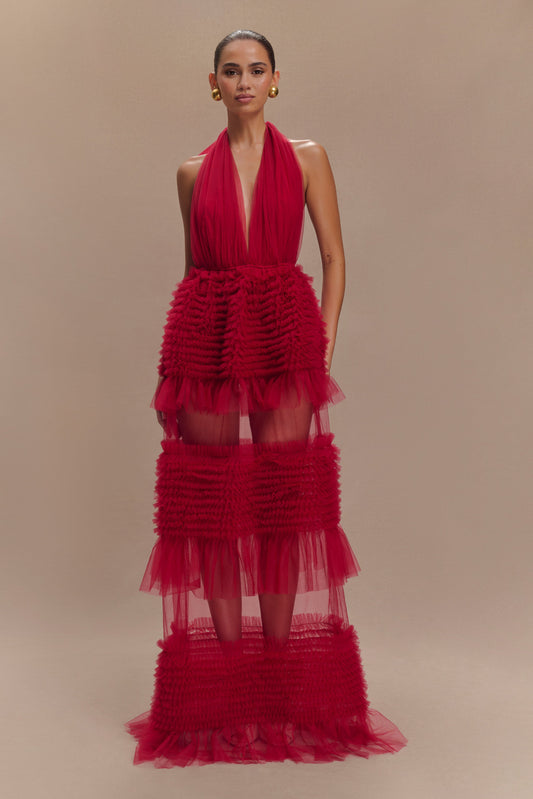 Minka Mesh Ruffle Halter Maxi Dress - Red
