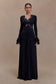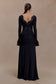 The ELECTRA Slinky Lace Maxi Dress blends sultry detail with fluid design. Featuring a deep V lace neckline and fitted silhouette, this dress hugs the body while lace cut-outs add delicate intrigue. A cascading front-side tie drape brings graceful movement, while flared layered sleeves evoke a sense of vintage romance. Partially lined for contrast and comfort, this dress is designed to turn heads—whether it’s a moonlit dinner or a statement-making soirée.