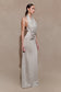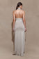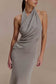 The ELMA Lurex Knit Halter Maxi Dress captures sleek allure through its fluid form and subtle shimmer. Designed with an asymmetrical halter neckline and open back, it frames the shoulders with sculptural ease. Draped gathering at the waist creates a flattering silhouette, while the lurex knit fabrication catches the light in tones of plum and silver. Cut to a maxi length and left unlined for a natural drape, this dress is the epitome of effortless evening glamour.