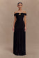 The KELLIE Off Shoulder Crepe Maxi Dress is designed to command attention with its striking blend of structure and softness. Featuring a bardot neckline and fitted crepe bodice, this silhouette is elevated with a sheer mesh bust overlay and statement front hardware for a touch of modern edge. The mesh lower skirt adds fluidity and contrast to the structured top, creating a balanced and elegant finish. Full-length and form-flattering, this dress is your statement piece for elevated evenings and unforgettable occasions.